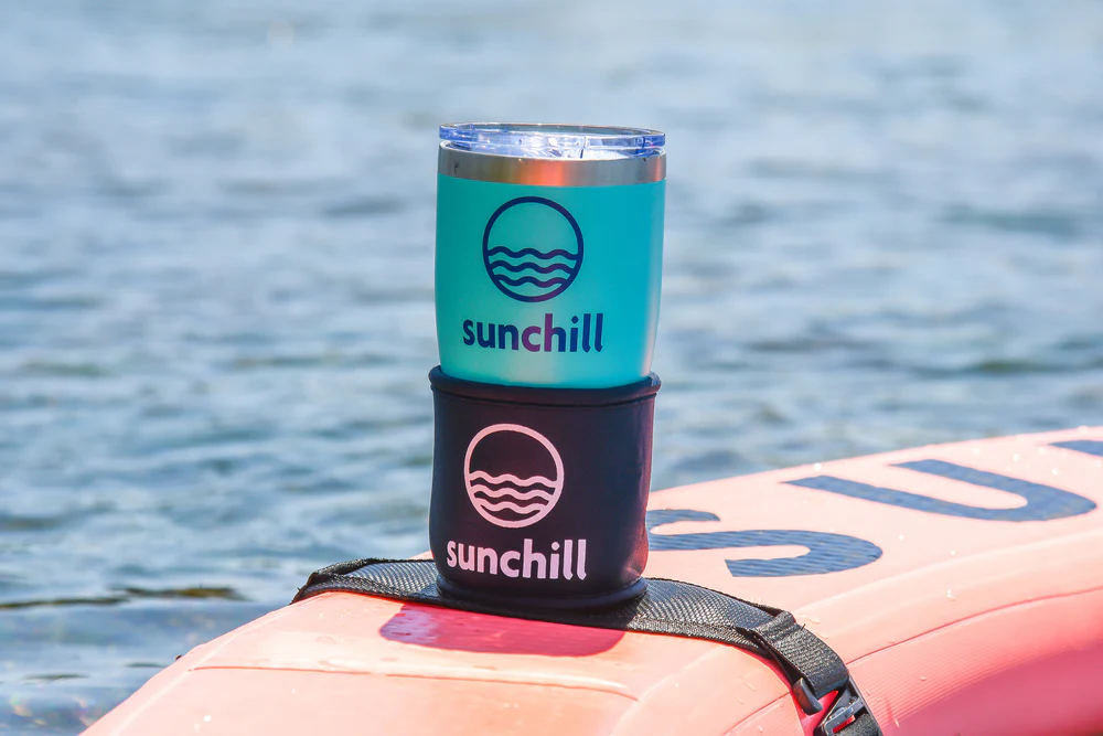 Each Megachill comes with a set of four strap-around drink holders. They include a thick neoprene cup sized to fit a 12-oz can with a koozie on it and have a bit of stretch to fit larger bottles and tumblers.